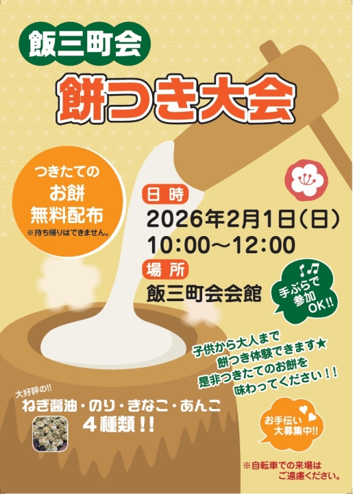 2月4日(日)10時~12時に飯三町会会館で久しぶりに餅つき大会を行いました。